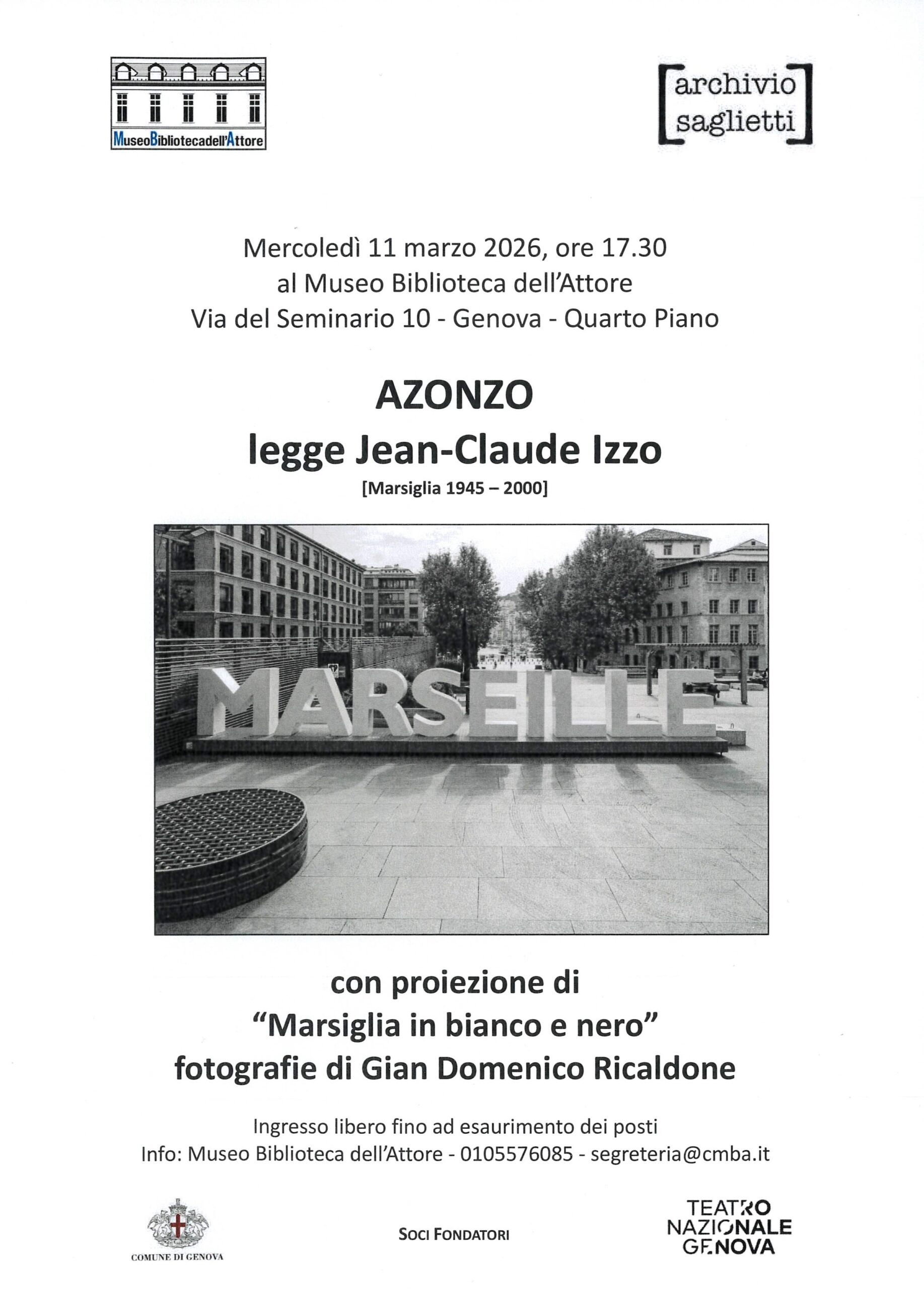 Mercoledì 11 marzo 2026, ore 17.30al Museo Biblioteca dell’AttoreVia del Seminario 10 – Genova – Quarto Piano IL GRUPPO TEATRALE AZONZOLEGGEJEAN-CLAUDE IZZO Proiezione di“Marsiglia in bianco e nero”fotografie di Gian… Leggi tutto: Jean-Claude Izzo e Marsiglia, protagonisti al Museo Biblioteca dell’Attore - Neurofisiologia della fotografia. Un corso sulla visione artistica al Museo Biblioteca dell’Attore (marzo–aprile 2026)