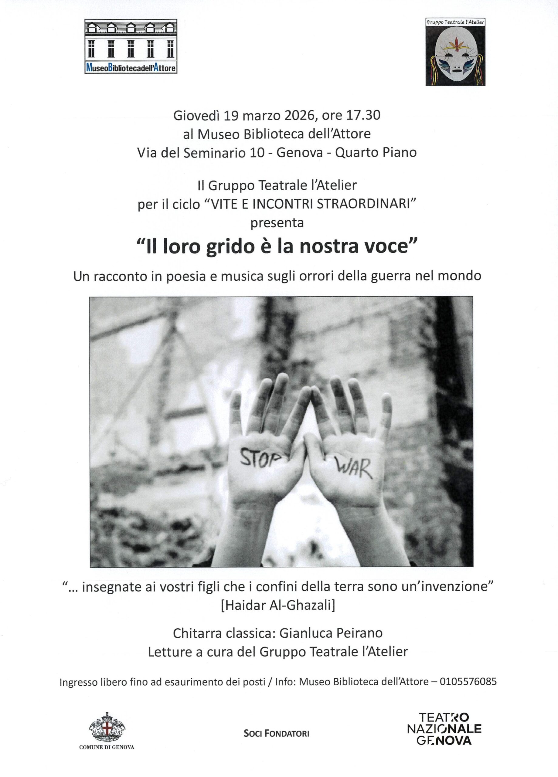 Giovedì 19 marzo 2026, ore 17.30al Museo Biblioteca dell’AttoreVia del Seminario 10 – Genova – Quarto Piano Il Gruppo Teatrale l’Atelierper il ciclo “VITE E INCONTRI STRAORDINARI”presenta “Il loro grido… Leggi tutto: Vite e incontri straordinari: “Il loro grido è la nostra voce”. Poesia e musica contro la guerra - Presentazione del libro: La vita è un pasticcio scenico, di Edoardo Boncinelli e Gianluca Serafini