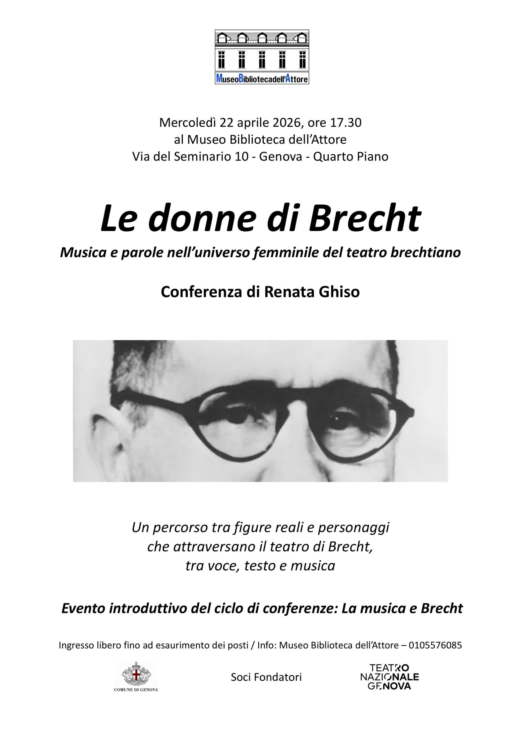 Mercoledì 22 aprile 2026 alle ore 17.30, presso il Museo Biblioteca dell’Attore, si terrà la conferenza Le donne di Brecht: musica e parole a delineare l’universo femminile del teatro brechtiano, a… Leggi tutto: Le donne di Brecht. Musica e parole nel teatro brechtiano - La musica e Brecht // Ciclo di incontri