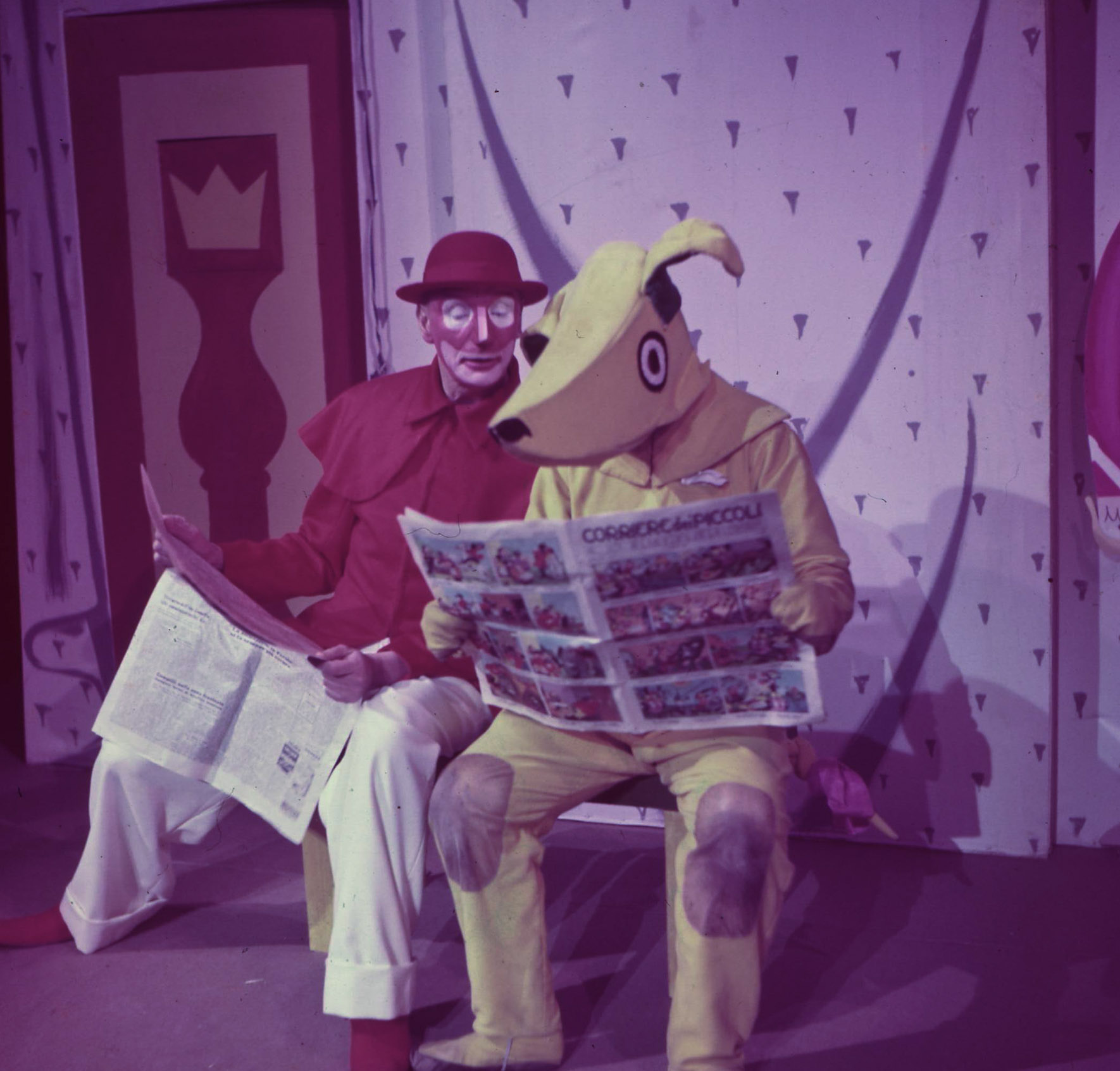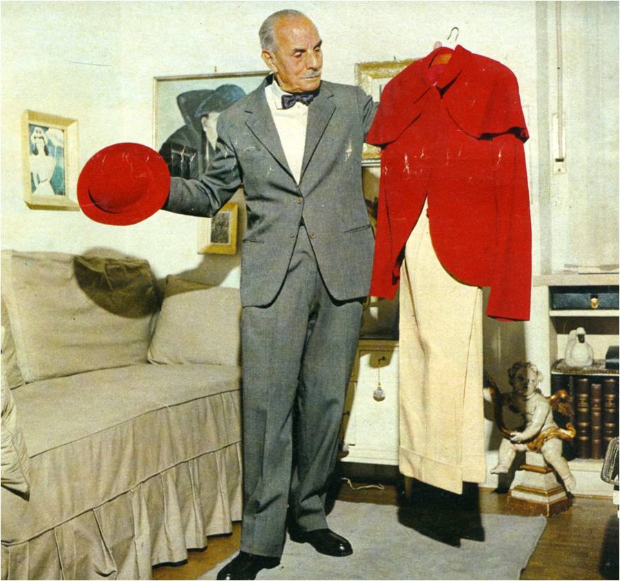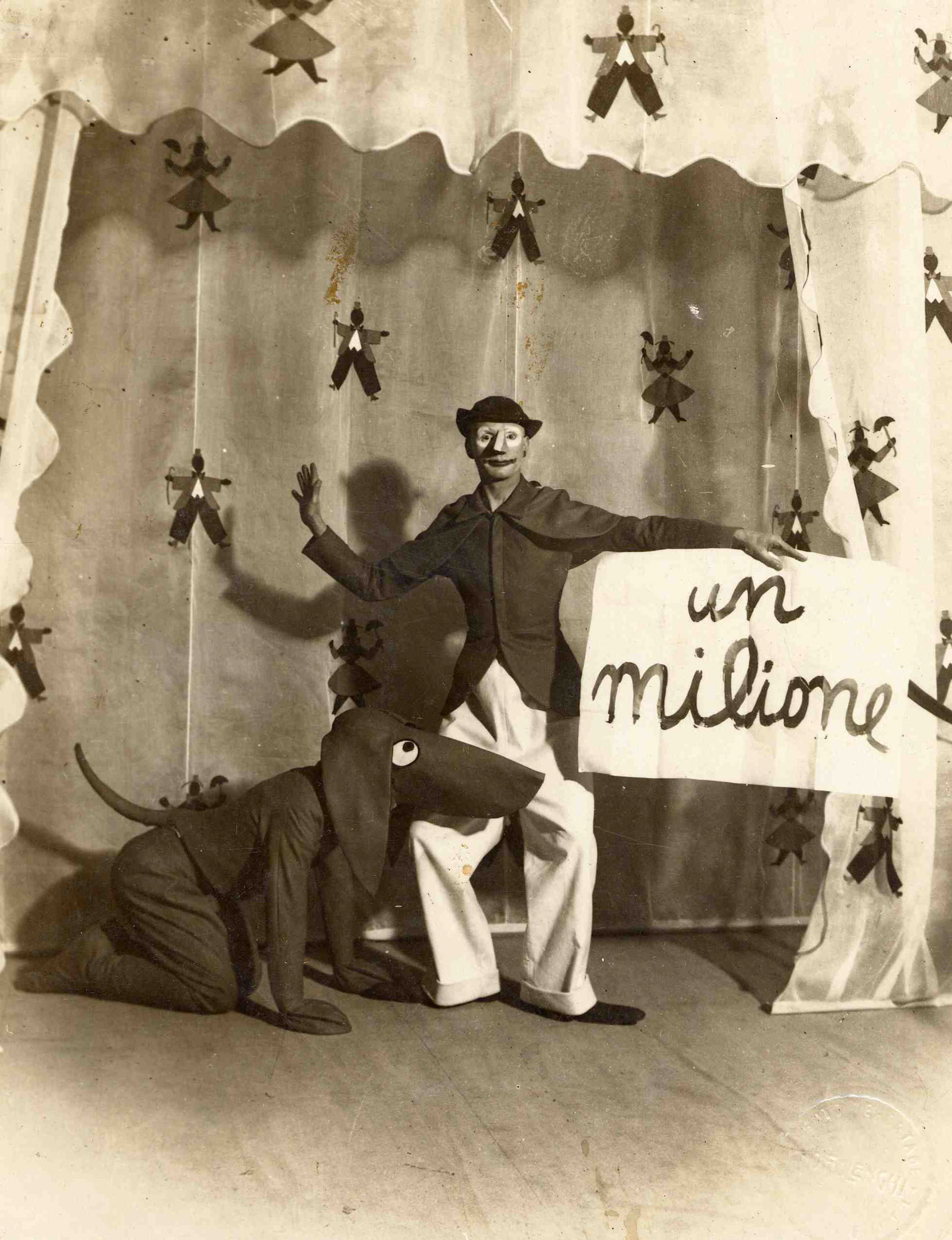 Sergio Tofano mostra il costume del signor Bonaventura nella sua casa di Roma