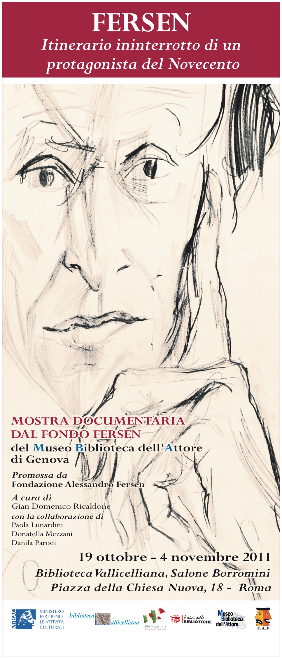 A seguire, verrà inaugurata la mostra FERSEN, Itinerario ininterrotto di un protagonista del Novecento che, curata da Gian Domenico Ricaldone, vedrà esposti per la prima volta documenti attinti dal Fondo Fersen ora conservato al Museo Biblioteca dell’Attore di Genova. L’itinerario artistico prevede un excursus dettagliato tra le varie tappe della carriera ferseniana: la parentesi del cabaret “I Nottambuli”, il Teatro ebraico (Salomone e la regina di Saba e Lea Lebowitz), le regie di prosa più celebri (L’Avaro con Sergio Tofano, Sganarello, Golem, Le Diavolerie in Italia e Polonia, Leviathan), molte delle quali realizzate insieme all’amico Lele Luzzati, il cinema internazionale, le attività varie di autore di canzoni, critico d’arte e autore televisivo, i convegni e i legami con Rensi, Sbarbaro e Colli, lo Studio Fersen, i seminari e il Laboratorio del Mnemodramma. Il tutto raccontato tramite documenti originali, tra cui carte e agende personali, lettere, copioni, fotografie, bozzetti e figurini di Luzzati, locandine, manifesti, programmi di sala, ritagli stampa, volumi su Fersen e, non ultimo, un inedito ritratto di Fersen dipinto da Mario Mafai nel 1943. A presentare la mostra insieme al curatore saranno Luigi Maria Lombardi Satriani, Presidente del comitato nazionale per le celebrazioni del centenario della nascita di Alessandro Fersen ed Eugenio Pallestrini, Presidente del Museo e Biblioteca dell’Attore. La mostra sarà aperta fino al 5 novembre, dal lunedì al sabato, ore 10.00 – 13.00.